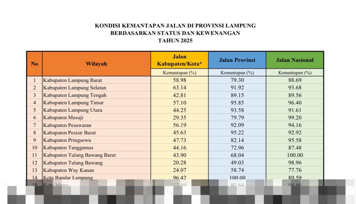 Dalam konteks kemantapan jalan di Lampung, data yang dirilis menunjukkan adanya kesenjangan yang signifikan. Pada tahun 2025, jalan nasional tercatat memiliki tingkat kemantapan sebesar 92,32%. Jalan provinsi berada di angka 79,79%, sedangkan jalan kabupaten/kota hanya mencapai 48,30%. Ini menunjukkan bahwa jalan yang berada di bawah kewenangan pusat dan provinsi lebih terawat dibandingkan dengan jalan yang dikelola oleh pemerintah kabupaten/kota.
